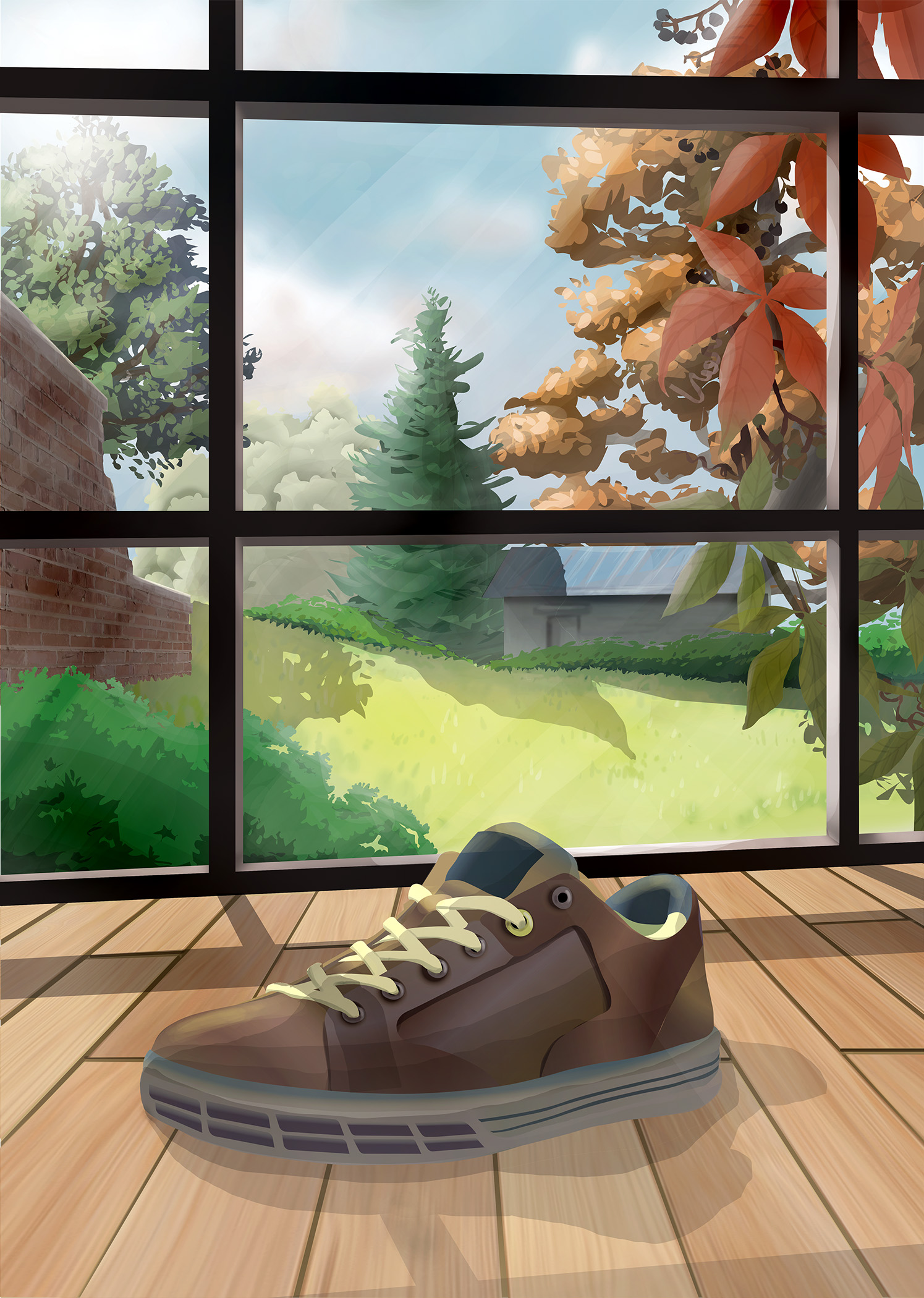 Illustration d'ambiance visant à mettre en valeur un objet simple. Ici une chaussure en cuir pour homme. La chaussure est réalisée sous illustrator et le décor sous photoshop dans avec une technique au lasso pour la cohérence graphique.