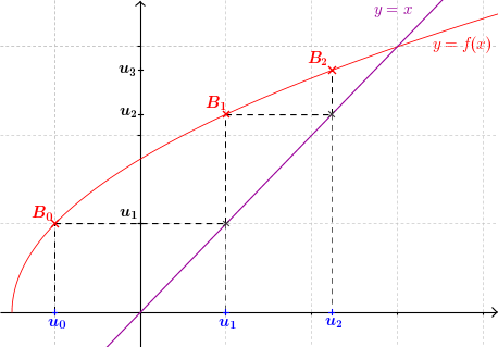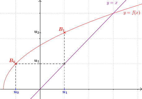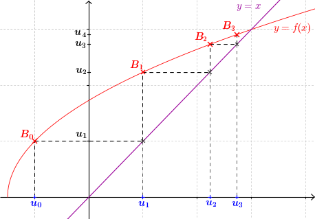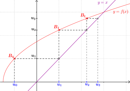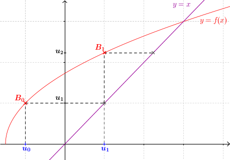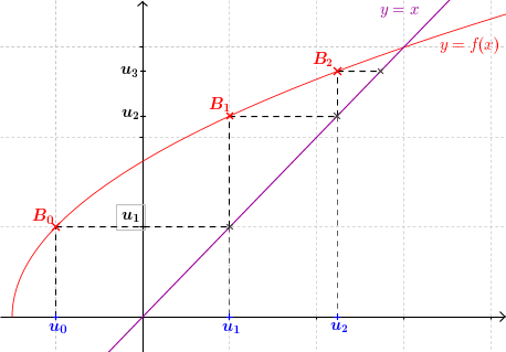 Cette propriété de point fixe formalise un phénomène déjà observé en première en représentant graphiquement des suites récursives convergeantes. Nous observions une évolution "en escaliers" ou en "spirale". Dans les deux cas, la suite est définie par : $$ \left\{ \begin{array}{lll} u_{n+1} &=& f (u_n) \\ u_0 &=& \text{valeur initiale} \end{array} \right. $$