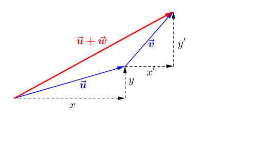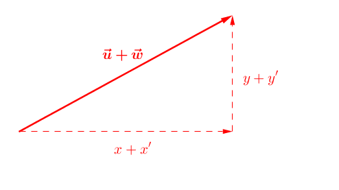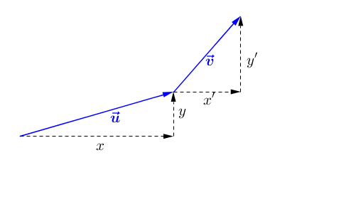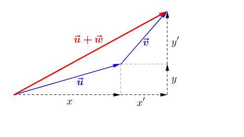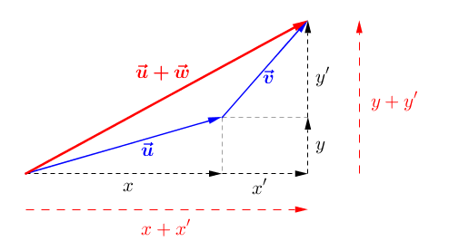 Soient \(\vec{u} = \left ( \begin{array}{c} x \\ y \end{array} \right ) \) et \(\vec{v} = \left ( \begin{array}{c} x' \\ y'\end{array} \right ) \) deux vecteurs quelconques. Les coordonnées de \(\vec{u} + \vec{v}\) se calculent simplement de la manière suivante : $$ \vec{u} + \vec{v} = \left ( \begin{array}{c} x + x' \\ y + y' \end{array} \right ) $$