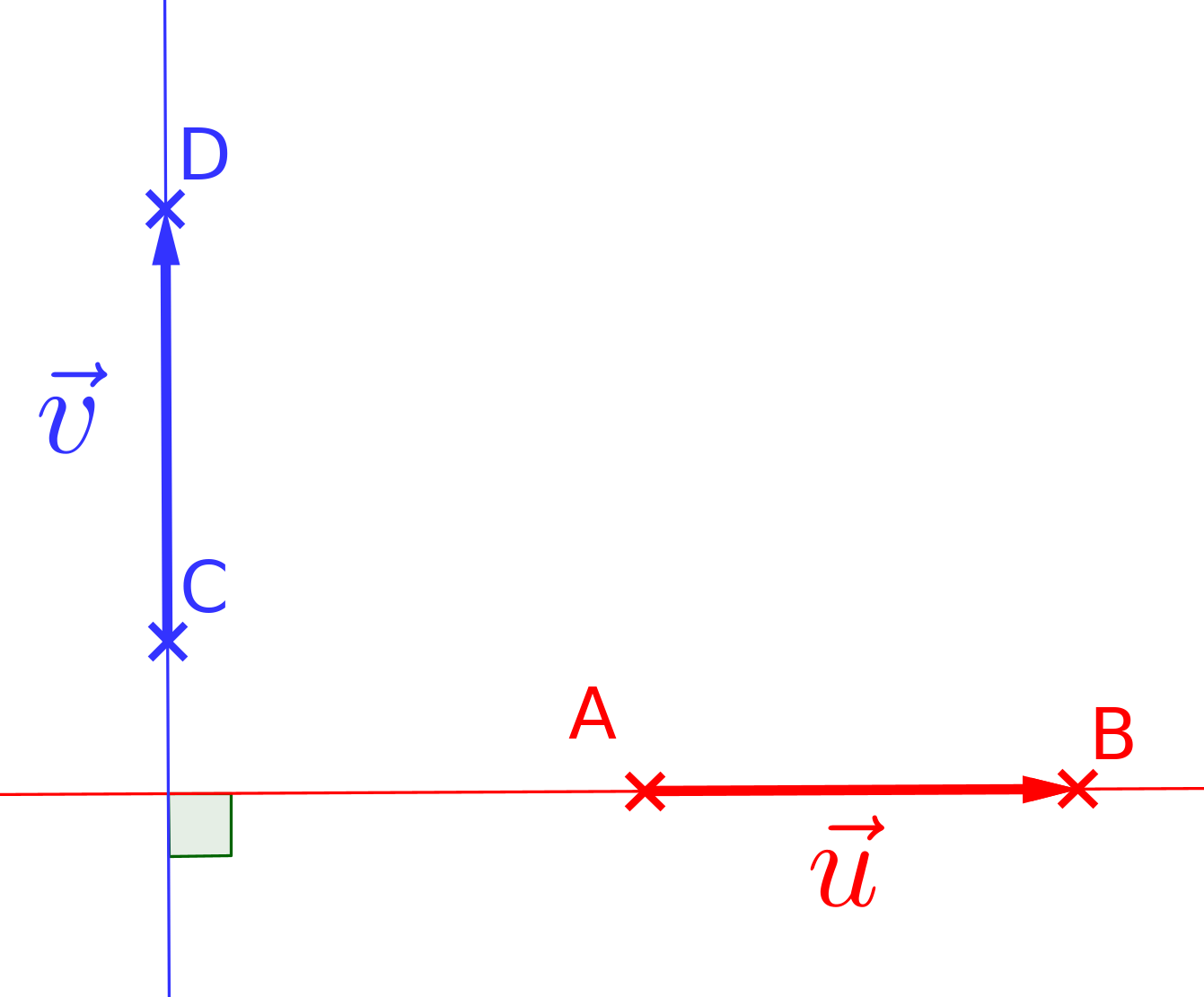 Les vecteurs $\overrightarrow{u}$ et $\overrightarrow{v}$ sont dits orthogonaux lorsque les droites $(AB)$ et $(CD)$ sont perpendiculaires.