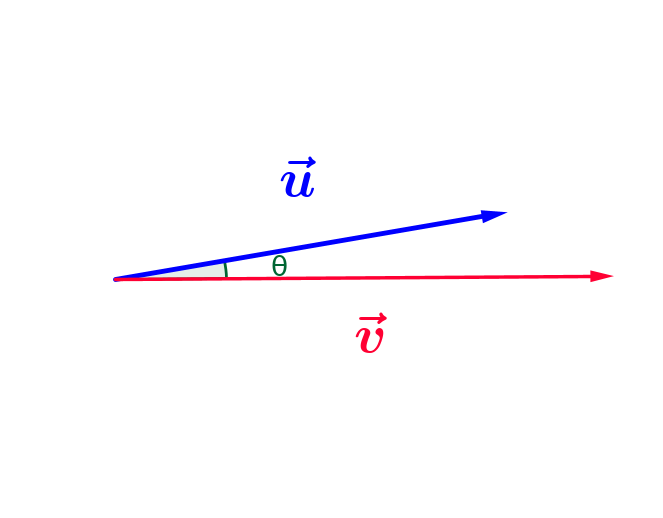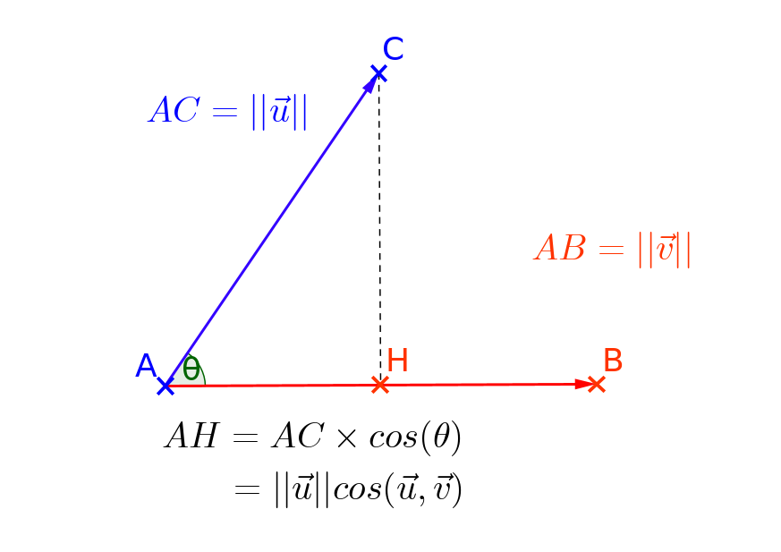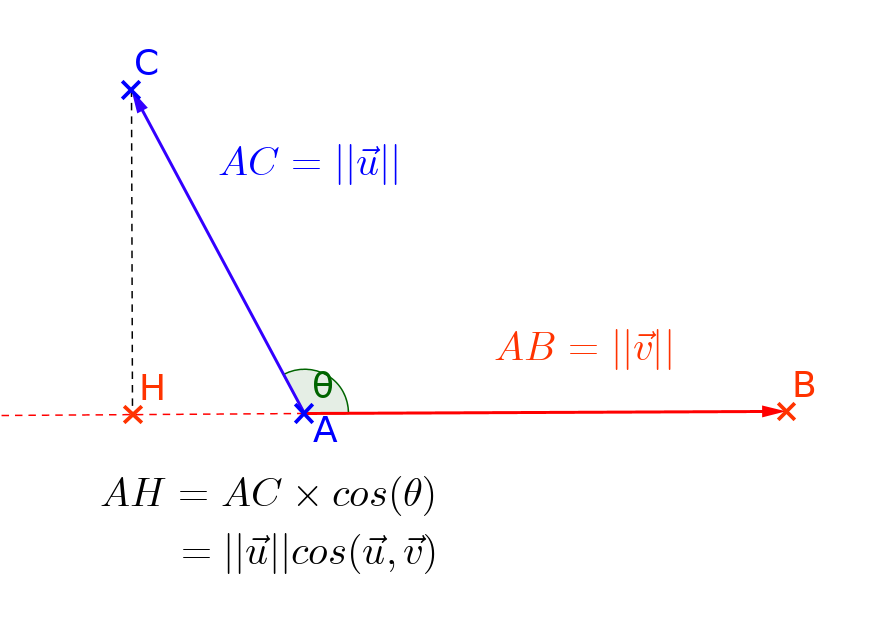 \[ \overrightarrow{u}.\overrightarrow{v}=||\overrightarrow{u}||\times||\overrightarrow{v}||\times \cos\left(\overrightarrow{u},\overrightarrow{v}\right) \]