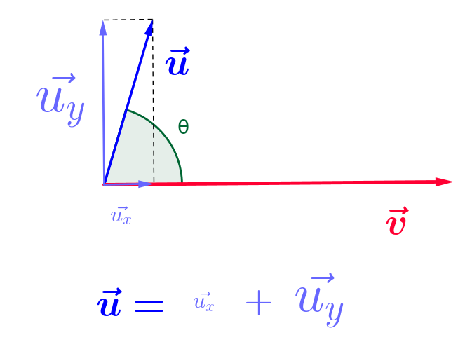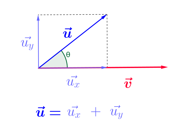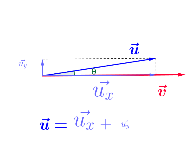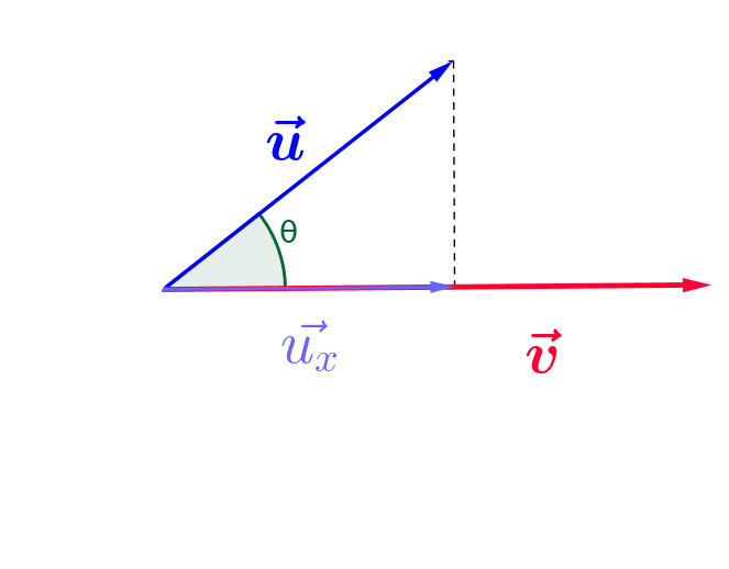 $\color{green}{cos(\theta)} = \frac{ ||\color{blue}{\vec{u_x}}||}{ ||\color{blue}{\vec{u}}||}$, donc $||\color{blue}{\vec{u_x}}|| = ||\color{blue}{\vec{u}}|| \times \color{green}{cos(\theta)}$